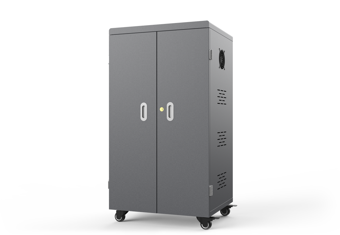 Transport, charge and store devices in the AHL-E64 64 slots smart charging cart. Move between classrooms and crowded hallways with 12.9-inch iPads and tablets neatly stored within the compact charging cart.